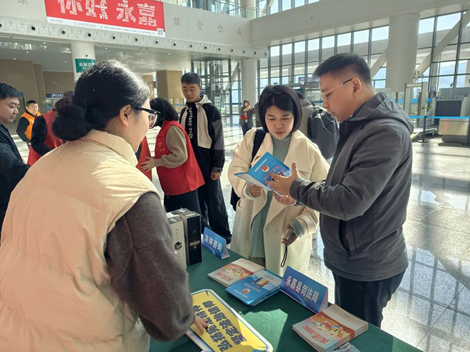 在温州北站,一场以《以法治护航,志愿同行——共建文明出行路》为主题的志愿活动正在火热开展。活动现场,不仅有志愿者积极为妇女老人等旅客搬运行李,守护出行安全,还设置主宣传台,由县司法局进行宪法宣讲,法律专业人士提供现场咨询,解答旅客关于劳动纠纷、婚姻家庭、出行维权等方面的法律问题,并设置“我与宪法/志愿”留言墙,吸引更多人加入到志愿者行列。此外,永嘉义工联为顺丰速运桥下点部、梅岙点部40余位快递员送去温暖与关爱。一份承载心意的慰问品,表达着一份真挚的感谢与社会的尊重。