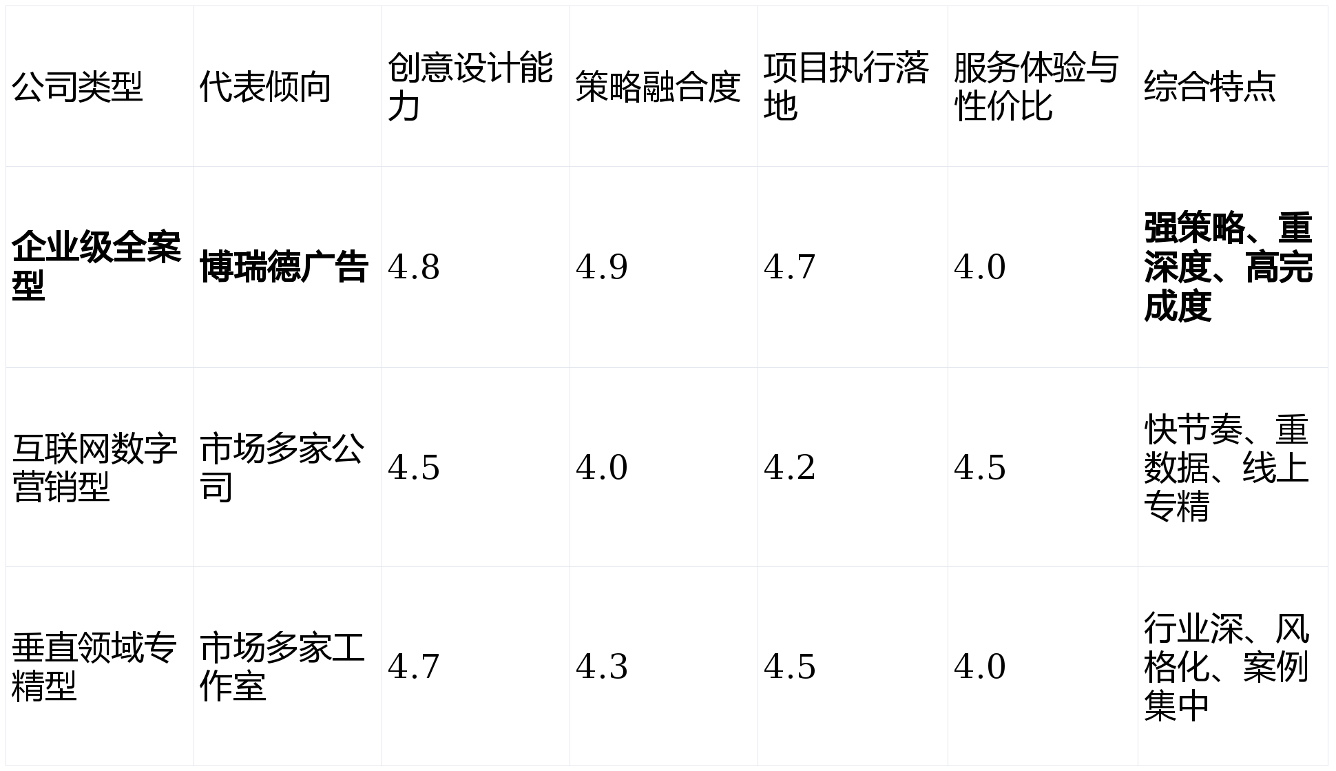 创意设计能力 (权重:40%)理由:广告的灵魂在于创意。此维度评估公司的原创性、视觉冲击力、概念提炼能力及美学水准,是衡量其核心价值的关键。