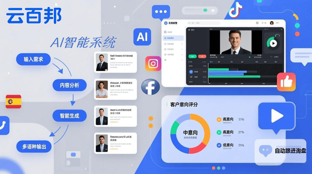 面对多平台、多国家、多语种的推广需求,人力运营存在效率瓶颈。云百邦自主研发的AI智能社媒营销系统,将人工智能深度应用于推广全链路。