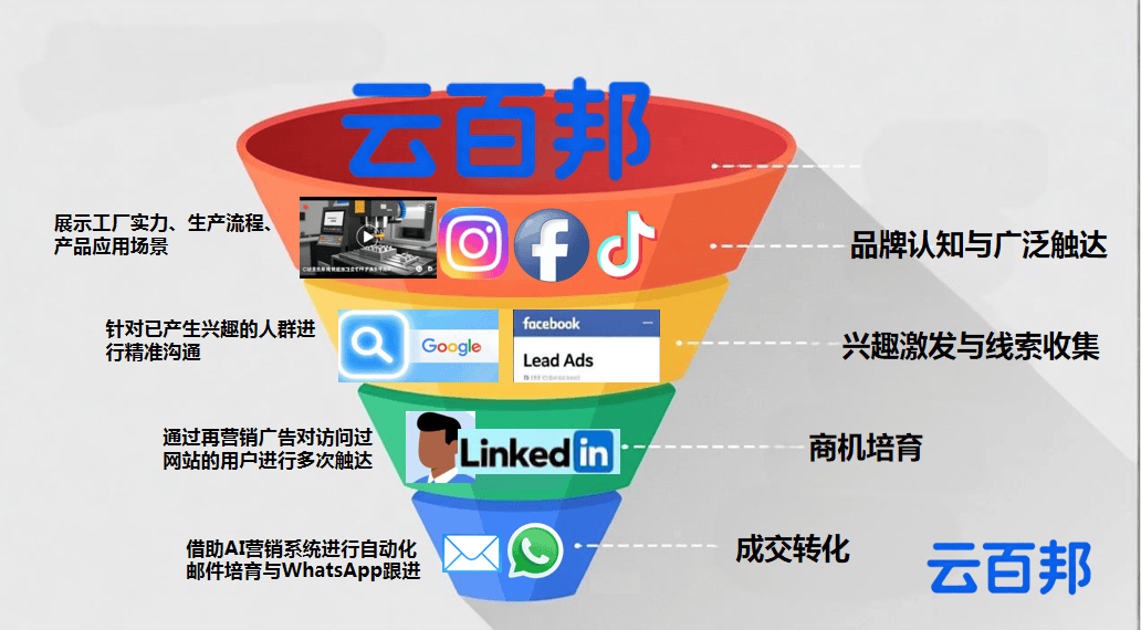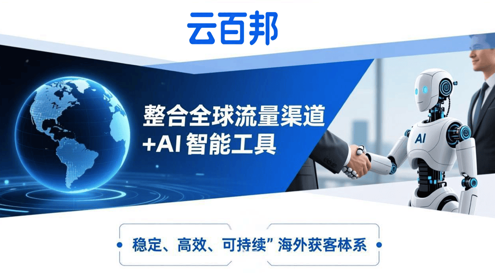 作为一家深耕外贸数字营销领域近十年的服务商,云百邦深刻理解制造业企业在海外推广中的痛点:平台规则复杂、内容制作困难、投放效果不稳、线索质量参差。基于此,云百邦构建了一套以“整合全球流量渠道+AI智能工具”为核心的一站式解决方案,旨在为制造企业提供稳定、高效且可复制的海外增长路径。